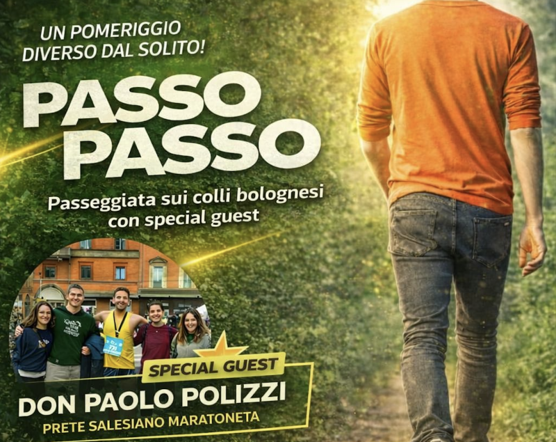 Passo passo 2026 evento diocesano per tutti i ragazzi e le ragazze dai 14 ai 18 anni una passeggiata sui nostri colli bolognesi per mettere in moto gambe e cuori, insieme ad un ospite speciale! Vi aspettiamo!